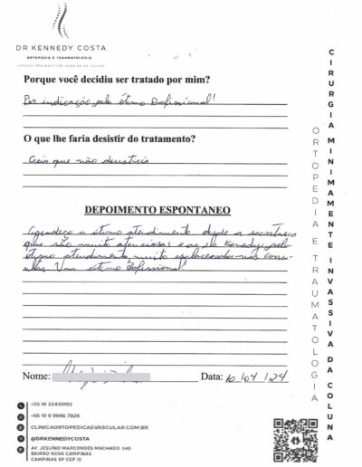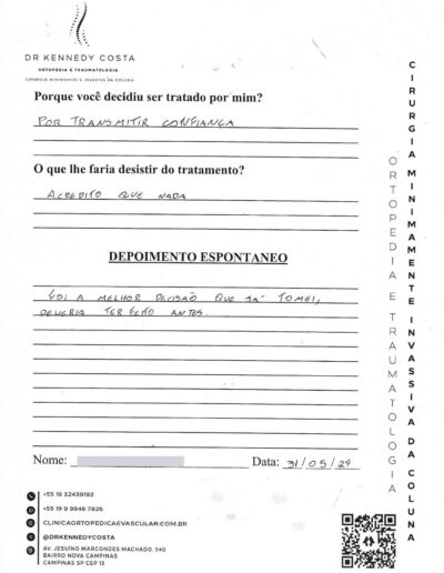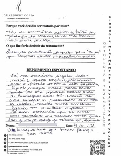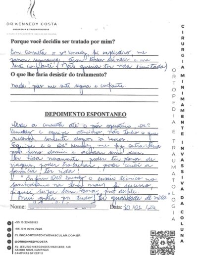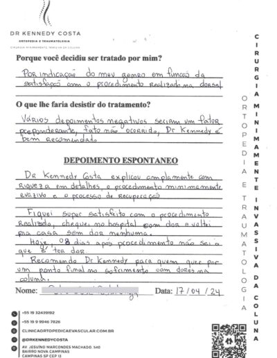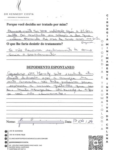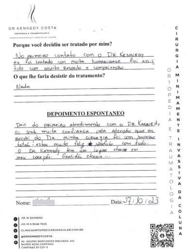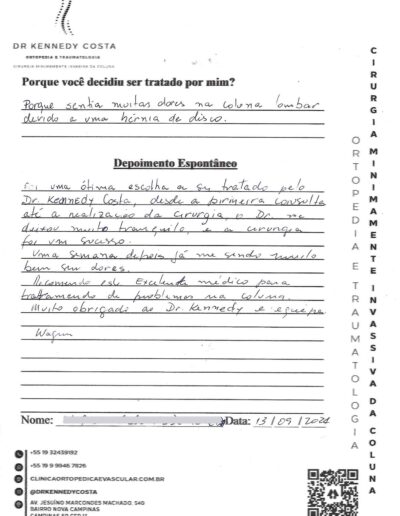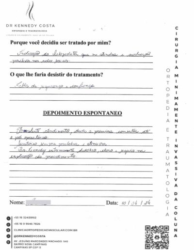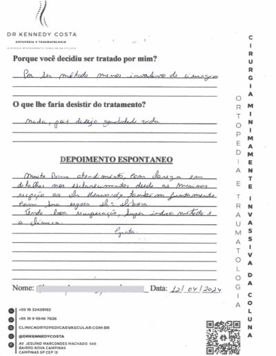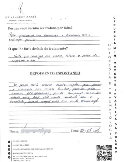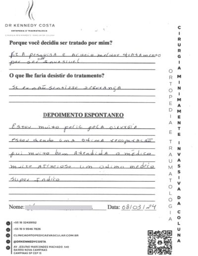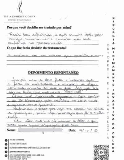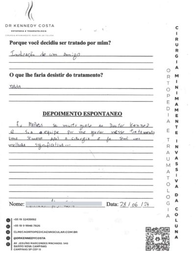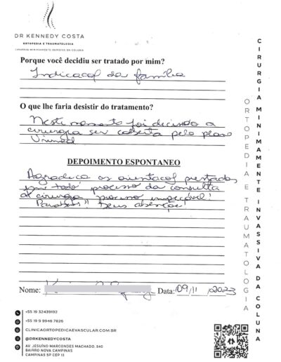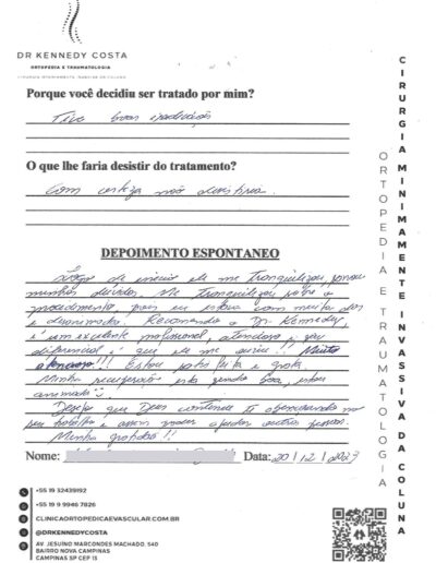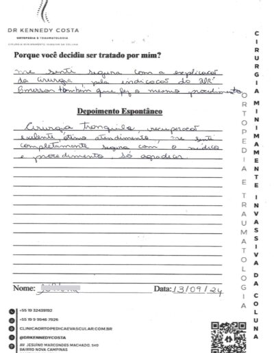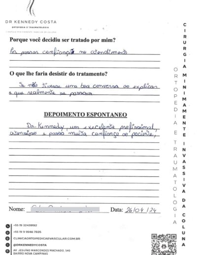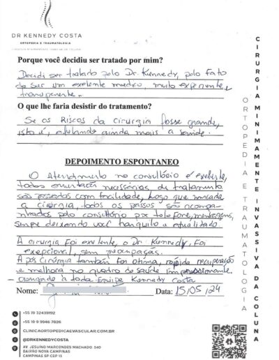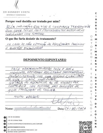 Notando-se excelente atendimento na consulta do Dr. Kennedy, e suas recepcionistas, avaliou os exames que havia trazido, e nos falou das hérnias, que na outra clínica nem citaram, só falaram da estenose.