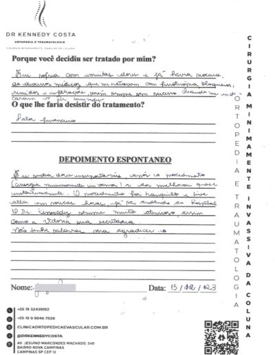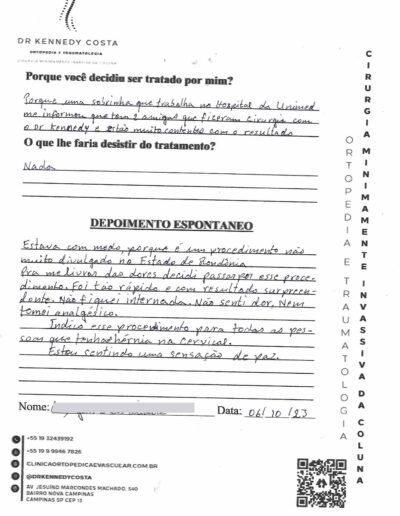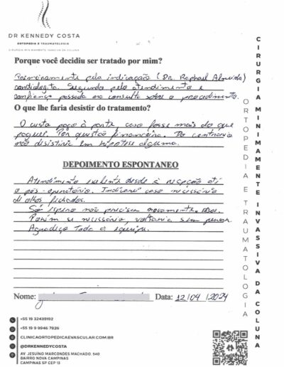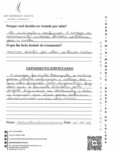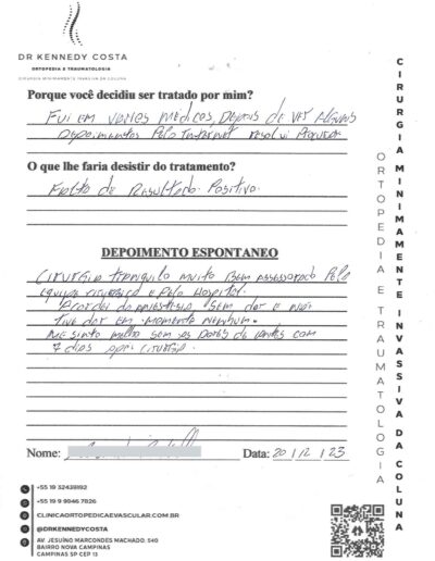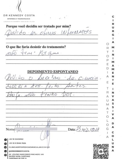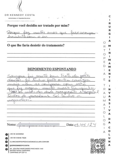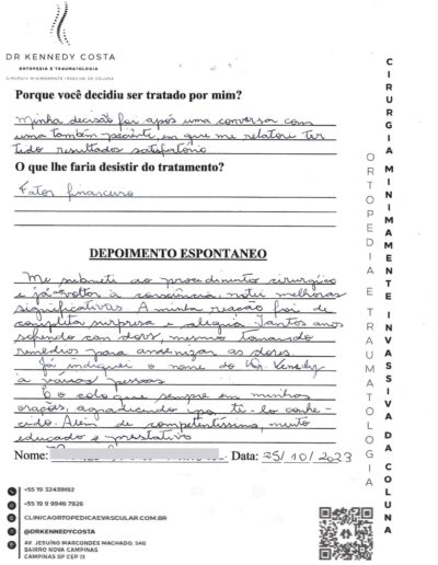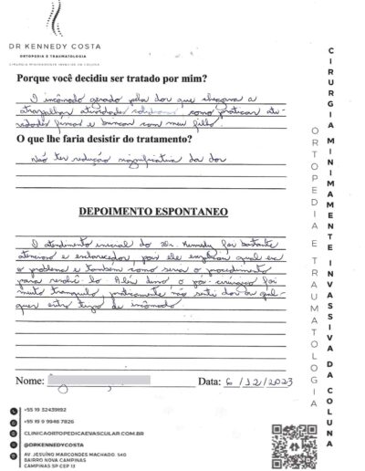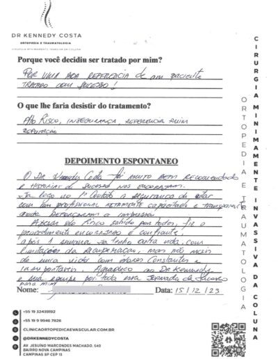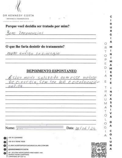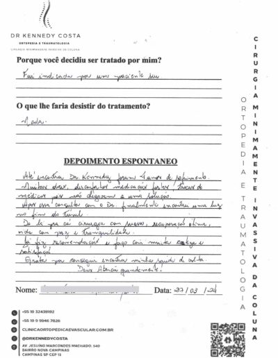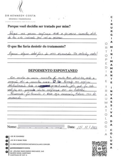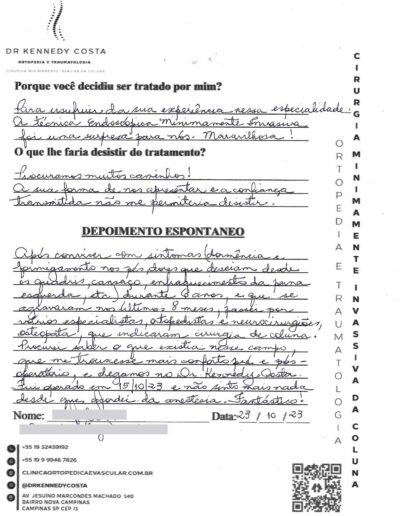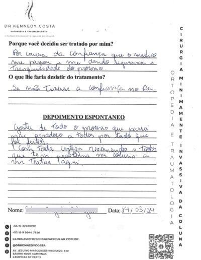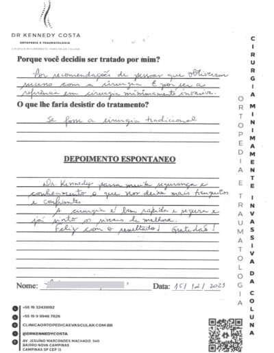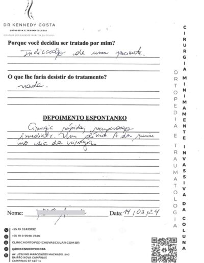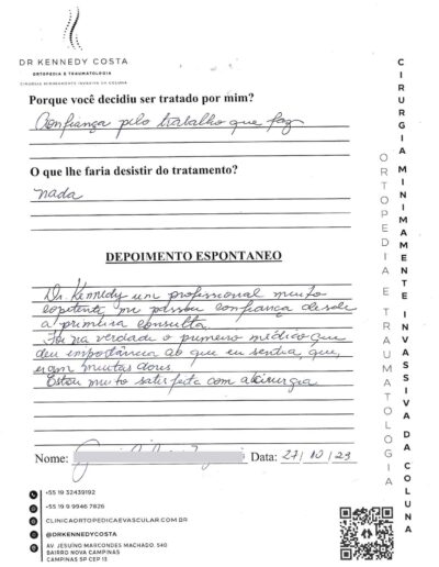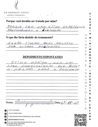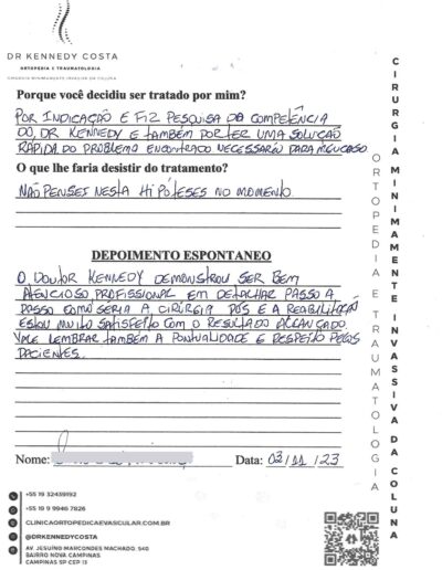 Notando-se excelente atendimento na consulta do Dr. Kennedy, e suas recepcionistas, avaliou os exames que havia trazido, e nos falou das hérnias, que na outra clínica nem citaram, só falaram da estenose.