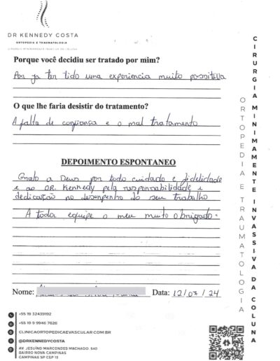 Fui muito bem atendida no consultório e também na cirurgia, os médicos e enfermeiros extremamente atenciosos, estou muito bem uma semana após as 2 cirurgias, lombar e cervical, realizadas pelo Dr. Kennedy.